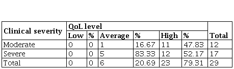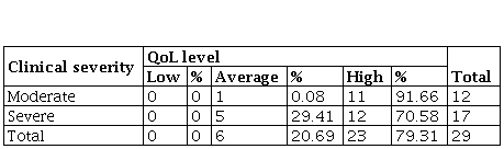 76% of patients presented a high QoL and the remaining 24% an average QoL. These outcomes are similar to those presented by Osorio et al. in 2013, where 67% of patients had an average or high QoL15.