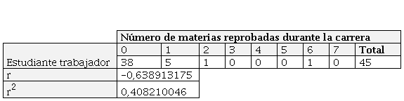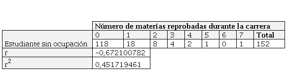 Se desarrollaron análisis de correlación para algunas variables consideradas clave en el estudio. Para el caso del número de materias reprobadas, se hizo una comparación de los estudiantes con o sin ocupación laboral, encontrándose los resultados de las Tablas 1 y 2, los cuales reflejan que en ninguno de los dos casos existe una correlación negativa, es decir, una correlación inversa, lo cual indica que a mayor cantidad de estudiantes con o sin ocupación, menor será el número de materias reprobadas. Se concluye que, para los sujetos y el contexto estudiado, el hecho de que el estudiante labore no ha sido un factor incidente en el bajo rendimiento académico desde la cantidad de materias reprobadas; además, el r. indica poca relación de variabilidad entre ambas variables.