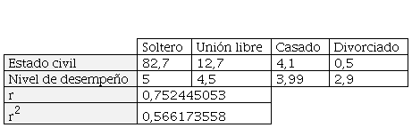 Seguidamente, se relacionó el nivel de desempeño académico acumulado por el estudiante durante la carrera, con el estado civil, encontrándose los resultados de la Tabla 5. Los resultados revelan que existe una correlación positiva, incidiendo el estado civil en el nivel de desempeño académico, lo cual afirma la concepción de Chilca12, a este respecto, aunque existe un nivel de dependencia baja en cuanto a variabilidad dado el coeficiente de determinación.