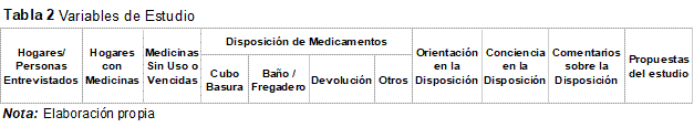 1.- Hogares/Personas Entrevistadas, 2.- Hogares con Medicinas, 3.- Medicinas sin uso o Vencidas, 4.- Disposición de Medicamentos, 5.- Orientación e la Disposición y 6.- Conciencia en la Disposición. La variable Disposición de Medicamentos se divide en 4 sub-variables que son: i.- Cubo Basura, ii.- Baño/Fregadero, iii.- Devolución, iv.- Otros. Todas estas variables cuantitativas son comunes en el conjunto de los trabajos seleccionados, las cuales evidencian el manejo de medicamentos en el hogar y la disposición de aquellos sin uso o vencidos.