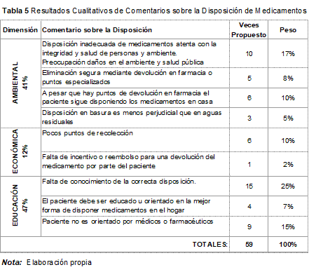 La información que se incluye en Comentarios sobre la Disposición de Medicamentos, se extrajo de cada trabajo seleccionado y resume las indagaciones de los investigadores en cuanto a las formas de disposición de medicamentos y qué piensa el paciente o consumidor en cuanto a esta disposición, así como el conocimiento y el nivel de conciencia que este tiene sobre el efecto que puede producir en el ambiente, y si hubo una orientación por algún especialista en salud, como médico o farmacéutico, en la forma apropiada de disponer los medicamentos sin uso o vencidos. Los resultados se presentan en la Tabla 5.