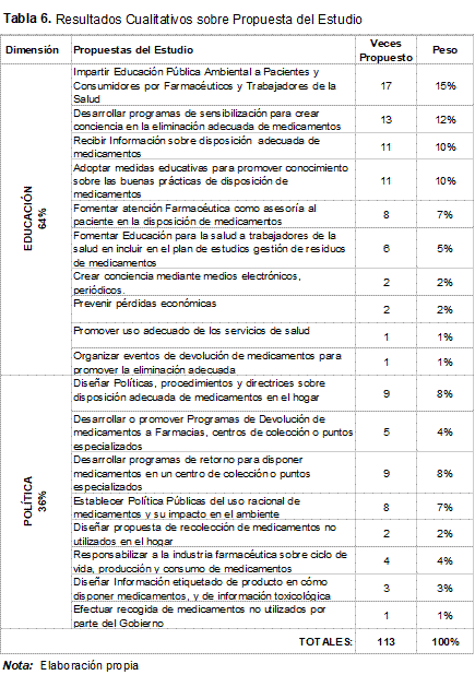 En cuanto a la información que se incluye en Propuesta del Estudio, se seleccionaron las principales soluciones que los investigadores proponen en sus trabajos como medidas correctivas para reducir el problema principal de investigación sobre la disposición de medicamentos en el hogar y su efecto en el ambiente y se presentan en la Tabla 6.