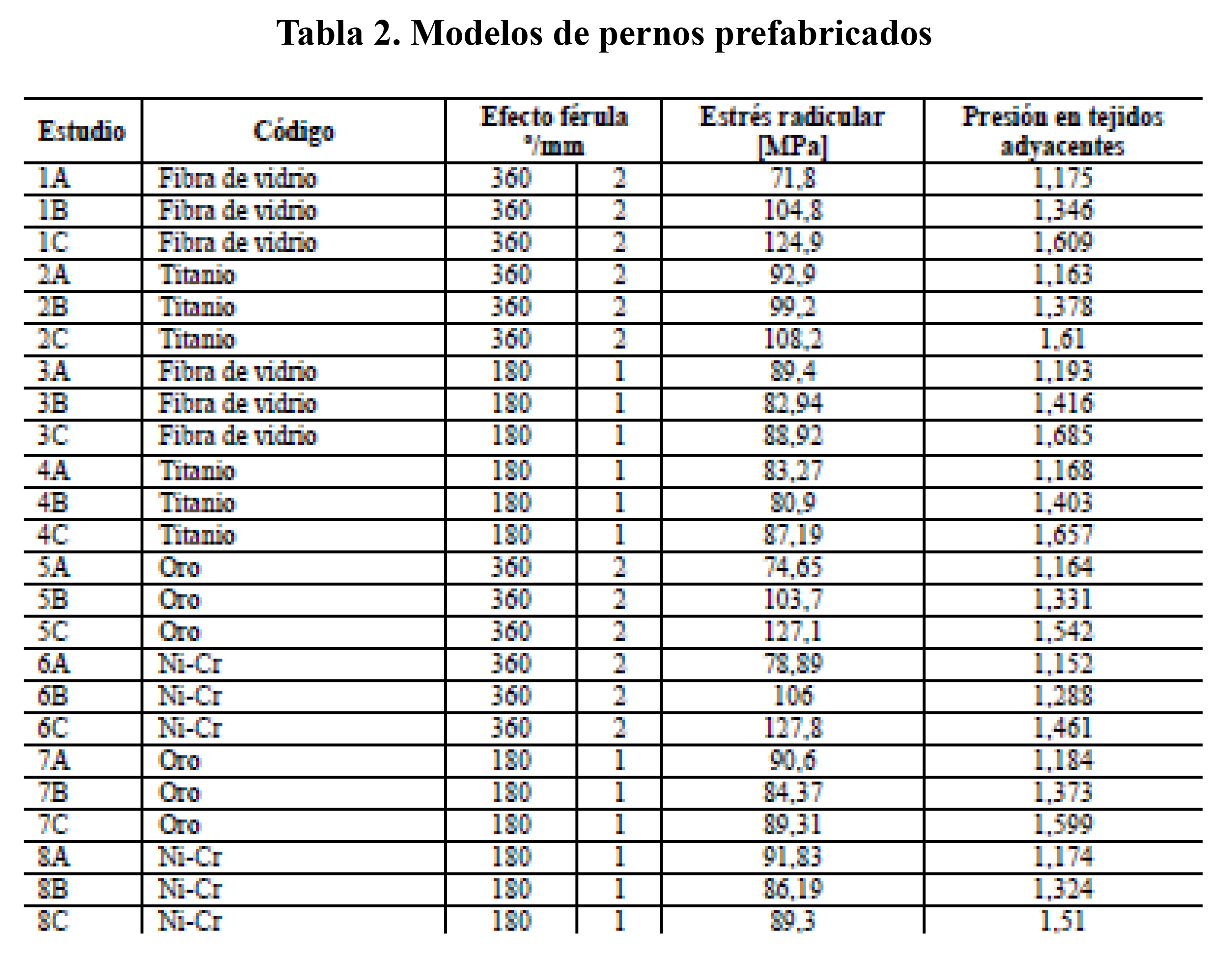 A partir de nuestros hallazgos se puede concluir que el nivel estrés radicular es mayor con los pernos colados de metal noble (Au) y NiCr, tanto a 360 y 180º, en comparación con los de fibra de vidrio y titanio; mientras que el nivel de presión ejercida en tejidos adyacentes en los premolares mostraron un mayor nivel de estrés con los pernos prefabricados a base de fibra de vidrio y titanio, ambos a 180º, en comparación con los de metal noble (Au) y NiCr. No obstante, es necesario desarrollar análisis con otras piezas del maxilar inferior con los pernos prefabricados y colados con metodologías alternativas para contrastar con los resultados obtenidos mediante el método de elementos finitos, así como combinar las presiones ejercidas en las áreas de contacto oclusal en las diferentes piezas dentales.
