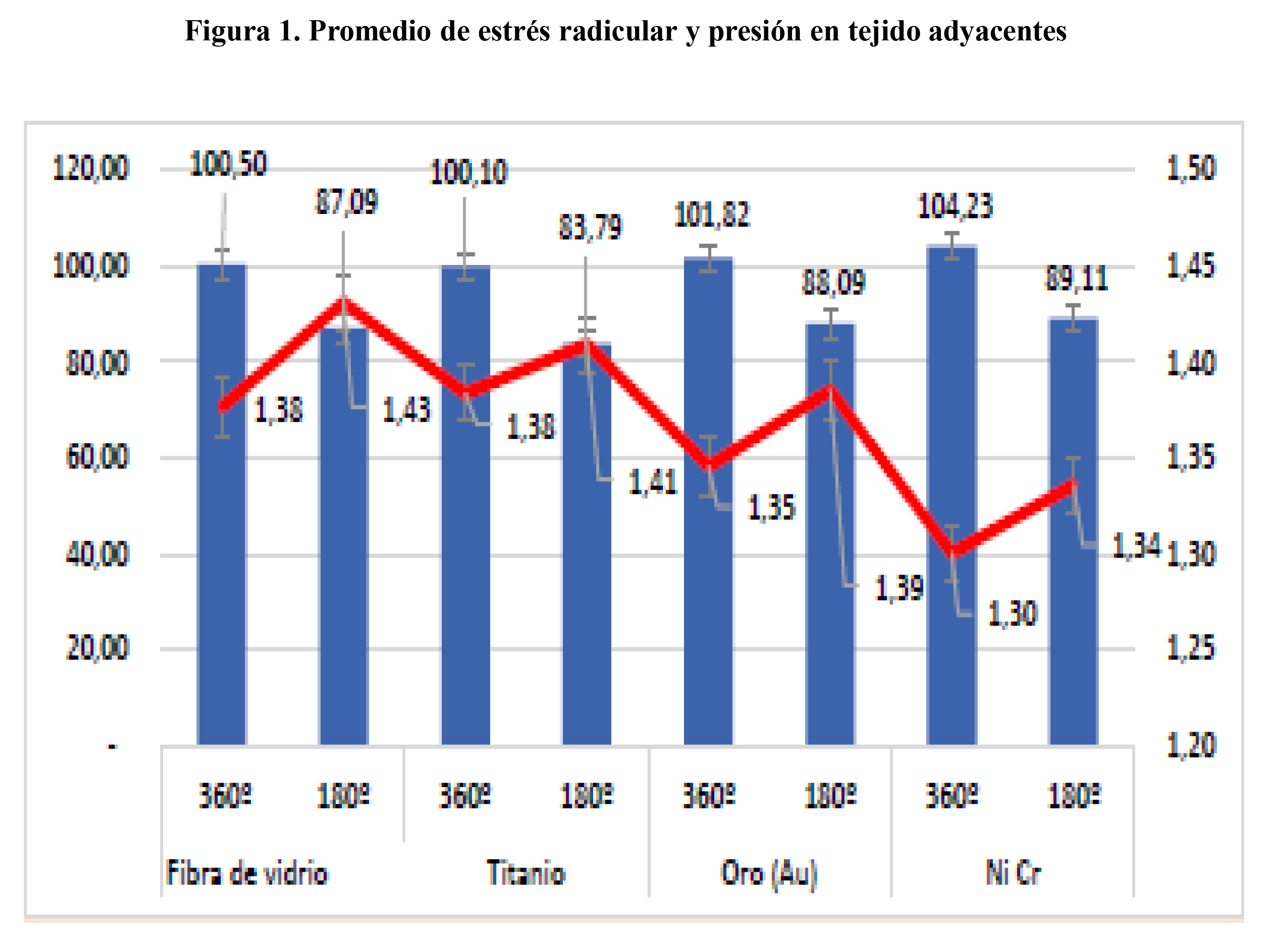 Mientras, la presión ejercida en tejidos adyacentes en los premolares fue mayor en los pernos prefabricados a base de fibra de vidrio y titanio a 180º en comparación con los de Au y NiCr, siendo el más representativo el de fibra de vidrio a 180º con 1,43 y el más bajo es el NiCr de 360º con 1,30. (Tabla 2; Figura 1).