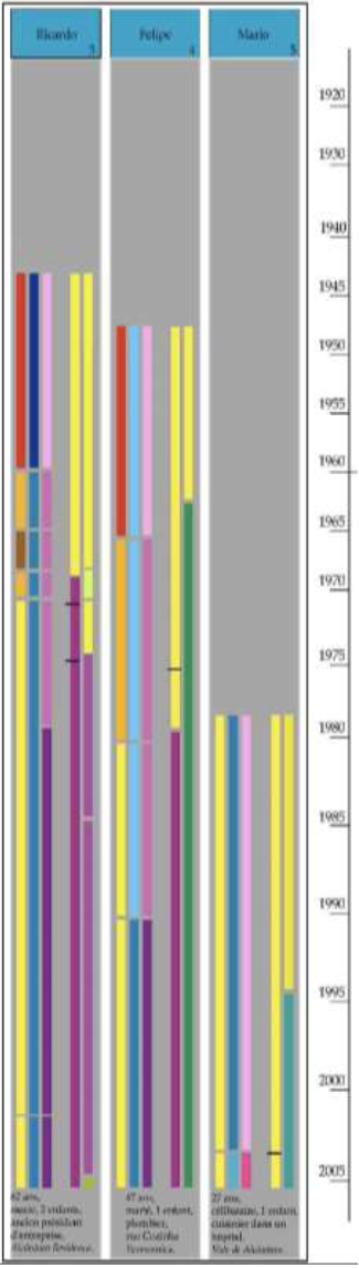 Como lo recuerdan C. Bonvalet y J. Brun, el recurso a esta noción de posición residencial inscribe el análisis de los estatus residenciales en el espacio geográfico, pero también en el tiempo largo, de la sucesión histórica y de sucesión de generaciones (2002: 36). Si las encuestas realizadas en el marco de este estudio no pudieron abordar la dimensión generacional, éstas, consistieron, sin embargo, en recopilar distintas informaciones de la biografía del individuo (familiares, profesionales y residenciales). El enfoque adoptado, inspirado en el trabajo de antropólogos y demógrafos en la década de 1960 (Pourcher, 1966; Courgeau, 1976), se interesa no sólo en las características de un individuo en un momento dado, sino también en la reconstrucción de la historia del individuo, la sucesión de etapas y los momentos clave de su vida. El análisis biográfico se refiere a un enfoque en el cual la hipótesis de la independencia entre los eventos (paradigma clásico de la demografía) es reemplazada por la de la existencia de interacciones entre los fenómenos (Courgeau, Lelièvre, 1989). En este sentido, esta forma de análisis relaciona diferentes tipos de eventos y de recorridos, migratorio, residencial, familiar y profesional.