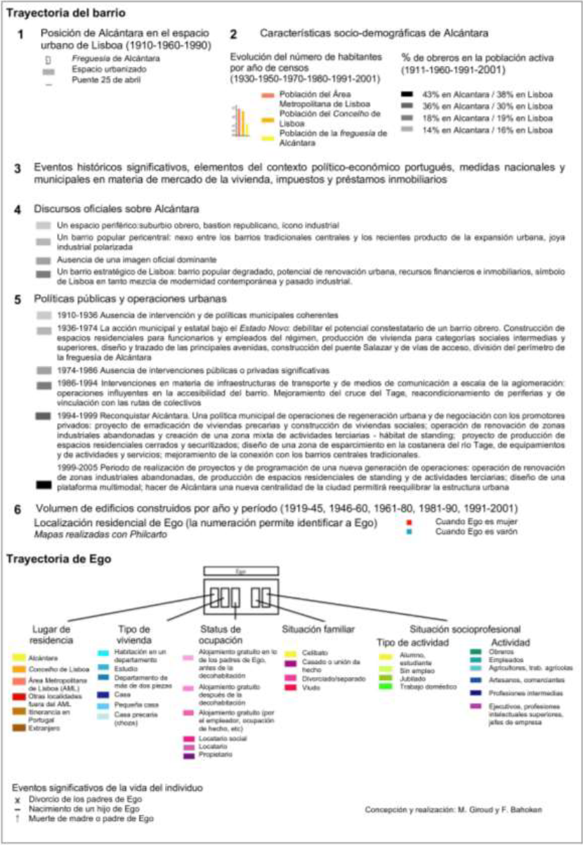Aquí se va a recurrir a dos conjuntos de información. El primero proviene de las encuestas Trajectoires, pratiques quotidiennes, et représentations du quartier realizadas en Alcántara y en Berriat Saint-Bruno. El objetivo es disponer de las informaciones que se refieran a la biografía del individuo, tomadas de una matriz biográfica (Alcántara) o de la técnica del relato de vida (Berriat Saint-Bruno), así como aquellas que conciernen a la descripción de las modalidades de instalación y de las condiciones de residencia actuales del encuestado. El segundo conjunto de datos permite una descripción dinámica de los barrios y los contextos locales estudiados. Las fuentes consultadas para retratar las trayectorias de Alcántara y Berriat Saint-Bruno han sido múltiples: trabajos universitarios, literatura científica, censos, documentos de urbanismo y de comunicación política, informes de estudios, etc.