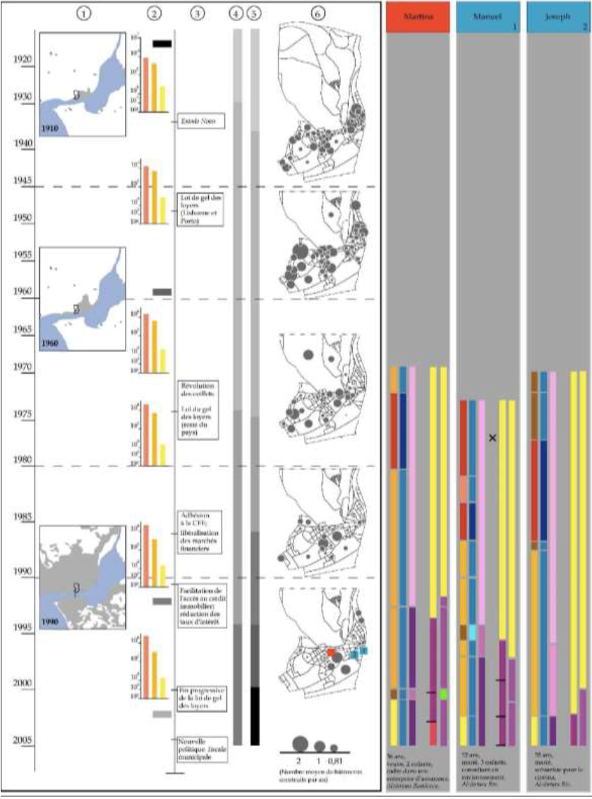 La heterogeneidad morfológica de la zona estudiada proporciona, de hecho, una diversidad de opciones de instalación. Las continuidades populares se basan, en efecto, esencialmente, en el parque de viviendas antiguas - las nuevas construcciones son rara vez accesibles para los hogares modestos. […] Es porque el antiguo parque de viviendas de estos barrios es actualmente lo suficientemente importante y diversificado, que permite a muchos residentes implementar ciertas prácticas y estrategias residenciales. Examinar la continuidad de estas presencias residenciales en un contexto de renovación urbana exige, de hecho, la observación más detallada de las características de las diferentes fracciones del parque de viviendas antiguas, así como sus capacidades diferenciales de transformación.