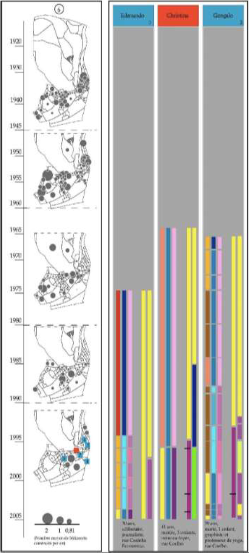 Construido principalmente sobre el caso de Alcántara, el análisis propuesto de la presencia residencial de los habitantes encuestados pasa por el cruce de estos dos tipos de datos, es decir, por la comparación de la trayectoria del barrio con los recorridos individuales. Cruzar cada recorrido individual con la trayectoria del barrio contribuye en efecto a confrontar la parte de las lógicas de actor y la de los determinantes estructurales en la explicación de la presencia residencial de los individuos; una relación que no es constante, sino que varía según los individuos, en función de sus historias personales, de sus experiencias urbanas y de sus recursos sociales, económicos o culturales.