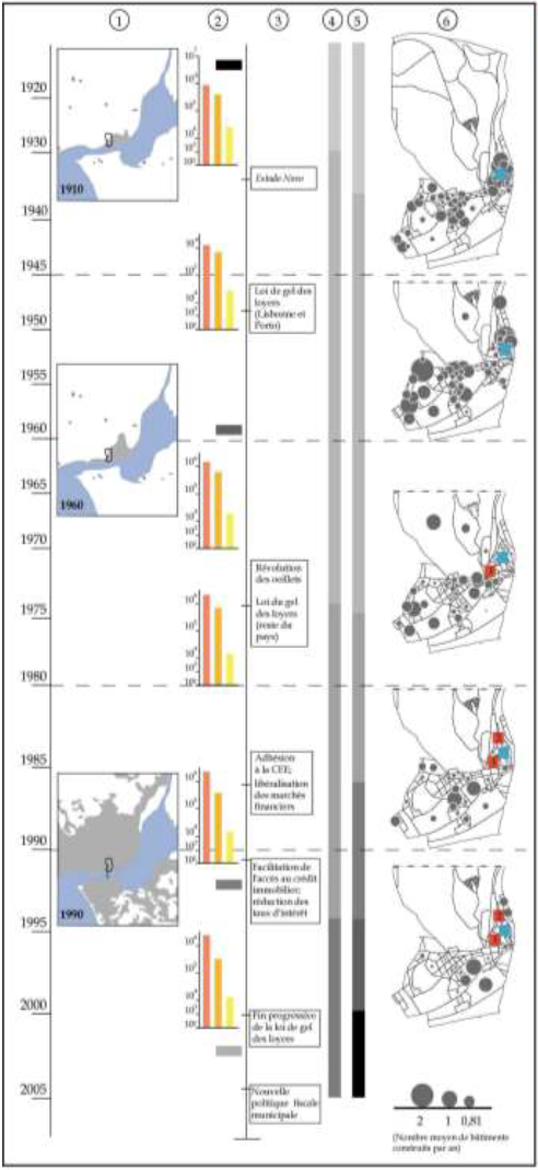 Los elementos contextuales presentados en la figura 1 recuerdan que desde 1993 Alcántara aparece en los discursos institucionales dominantes como un espacio simbólico y estratégico de Lisboa. En un sincretismo inédito, Alcántara se ha convertido en el lugar de encuentro entre un pasado industrial, una memoria económica local y nacional, la modernidad contemporánea y la innovación del mañana. Por otra parte, su estatus de puerta de entrada al centro histórico de Lisboa le ha otorgado una nueva posición en el seno del proceso de planificación del desarrollo y del marketing urbanos de Lisboa. El barrio tiene desde ese momento una identidad original para toda la ciudad, pero al mismo tiempo aparece como un símbolo al servicio de la imagen de la ciudad y, por lo tanto, como un nuevo lugar para la recepción de poblaciones estratégicas, calificadas y acomodadas. Estos discursos se materializan rápidamente en la segunda mitad de la década de 1990 a través de varios proyectos de renovación urbana cuyo objetivo es un cambio radical de las estructuras económicas, sociales, morfológicas y semánticas del barrio. En Alcántara, los discursos de revalorización territorial precedieron y, al mismo tiempo, acompañaron a una primera generación de intervenciones. Esto significa que, a mediados de la década de 1990, en un momento en que el barrio todavía posee un tejido urbano degradado (baldíos industriales y urbanos) y está viviendo una situación social frágil (precarización creciente de una parte de la población, especialmente los pensionados) incluso preocupante (existencia de una villa miseria, lugar de tráfico y consumo de drogas), los discursos oficiales comienzan a actuar como fuerzas polarizantes ante un primer conjunto de nuevos residentes, provenientes de la «nueva clase media» asalariada, evocado recurrentemente en la literatura sobre el proceso de gentrificación de los barrios populares centrales. (Lévy J.-P., 2002a). Pero estos discursos también anticiparon, de hecho, una segunda generación de intervenciones, marcada desde 1999 por la construcción de viviendas nuevas de lujo y que, a su vez, va a acelerar y masificar el movimiento.
