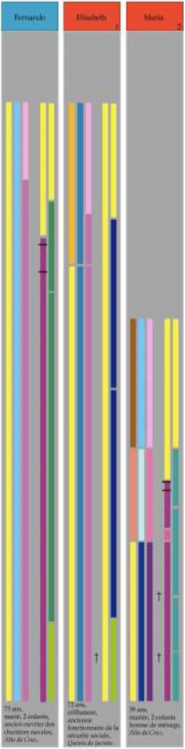 La reciente instalación en el parque de viviendas antiguas de Alcántara no es sólo protagonizada por representantes de las nuevas clases medias asalariadas. La Figura 1c muestra que Alcántara sigue siendo atractivo y accesible para otros grupos de población, en particular categorías sociales más modestas. Se muestra los recorridos de tres nuevos residentes del barrio, que se instalaron en viviendas viejas y baratas en condiciones a veces difíciles. Estos tres ejemplos revelan dinámicas y lógicas de asentamiento actualmente en funcionamiento en Alcántara, y que podemos observar, como lo muestra la cartografía, de manera privilegiada en los perímetros no afectados por la construcción de nuevos edificios.