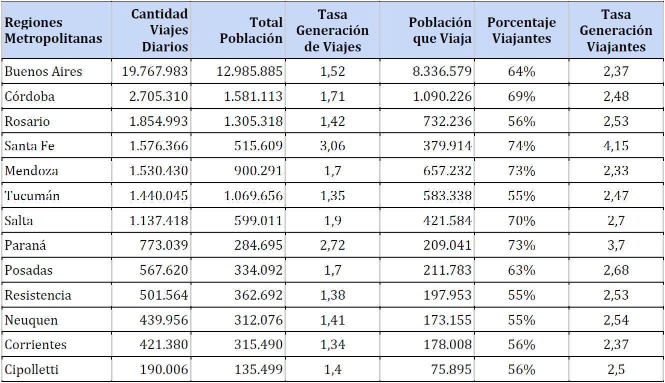 No obstante, se dispone de una serie de encuestas domiciliarias realizadas en las principales metrópolis argentinas entre 2008 y 2014, como parte integrante de un componente estadístico de un préstamo de un organismo internacional, que permite realizar comparaciones con sus debidas precauciones. Debe mencionarse que se registraron algunas deficiencias metodológicas, particularmente en lo que respecta a la implementación del modelo de encuesta en cada territorio (por ejemplo, los formularios se modificaron a través del tiempo detectando mejor las caminatas en las más recientes) y operativas en lo que respecta a la contratación de personal para la realización de las encuestas (cada ciudad se hizo cargo de las suyas, algunas contratando a más de una consultora). A pesar de ello, se trata de bases de datos muy valiosas que sirven de base para las investigaciones de movilidad urbana.