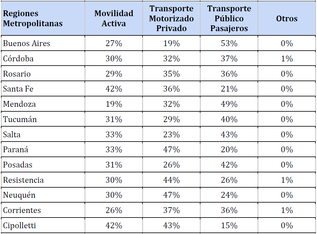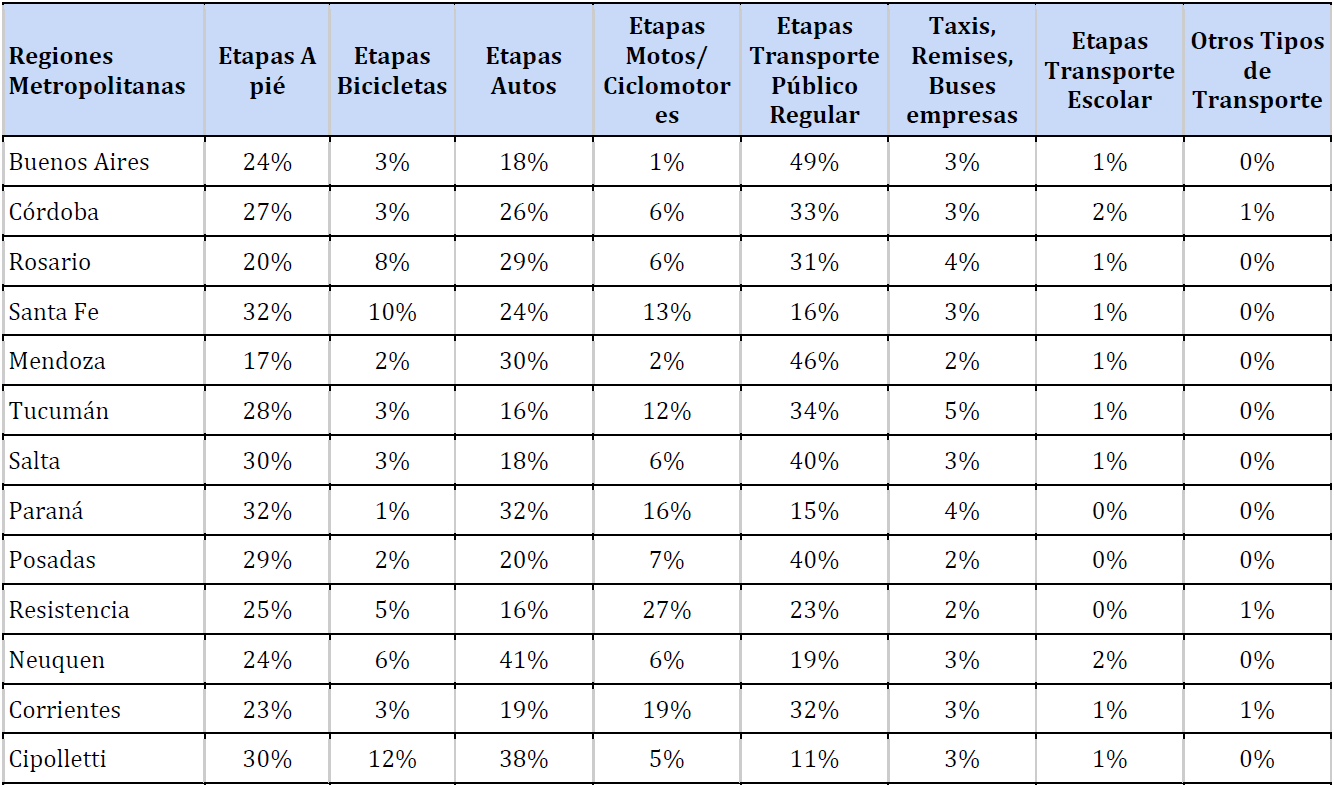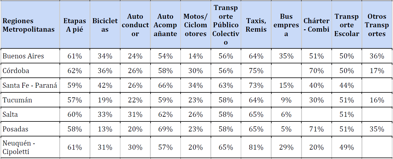 En relación al transporte público de pasajeros, con todas sus variantes moviliza el 46,8% de la población en alguna de las etapas de viajes. En Buenos Aires es donde se observa mayor uso, correspondiendo seguramente a la mayor oferta de cobertura y servicios en relación a otras ciudades, coincidentemente también con la cantidad de viajes que se realizan sobre la extensión que se cubre. Los modos privados particulares lo realizan en promedio para todas las ciudades en un 24,6% de los viajes. La movilidad peatonal representa el 28,3 % del total de los viajes.