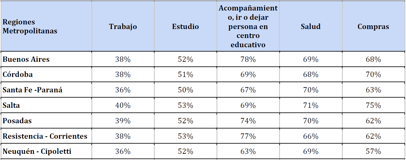 En este sentido, la movilidad por trabajo ronda entre el 36 y el 40%, dejando así casi un 60% en manos de los hombres. En el caso de estudio, las cifras se elevan un tanto, equiparando la movilidad en un 50% con los hombres. Sin embargo, como adelantamos, en el caso del trabajo doméstico o de acompañamiento a un familiar, en algunas ciudades llega a casi el 80% como en Buenos Aires. En el caso de las compras, se evidencia también un alto grado de participación de las mujeres.
