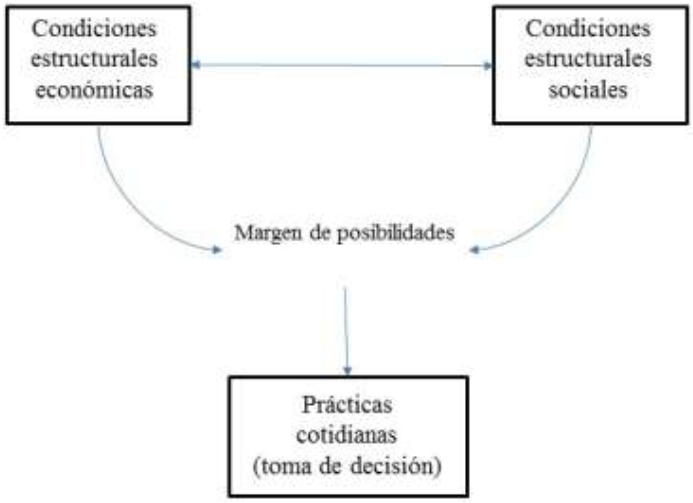 Debido a que no en todos los individuos se lleva a cabo un proceso de reflexividad y la deconstrucción de los conceptos de que han conformado su identidad (económico, social, cultural, geográfico, político, religioso) es que se optó por analizar a la MRI como un indicador que permitió establecer un primer acercamiento a las decisiones que toman los individuos con respecto a la elección residencial; reconociendo a la MRI como un fenómeno multifactorial y multidimensional donde las condiciones estructurales y las prácticas sociales están entrelazadas creando márgenes de limitaciones y facilidades en los posibles movimientos (ver figura 1), de ahí que se reconozca al movimiento y al no movimiento como decisiones, la decisión de mudarse o bien, la decisión de permanecer viviendo en la misma casa.