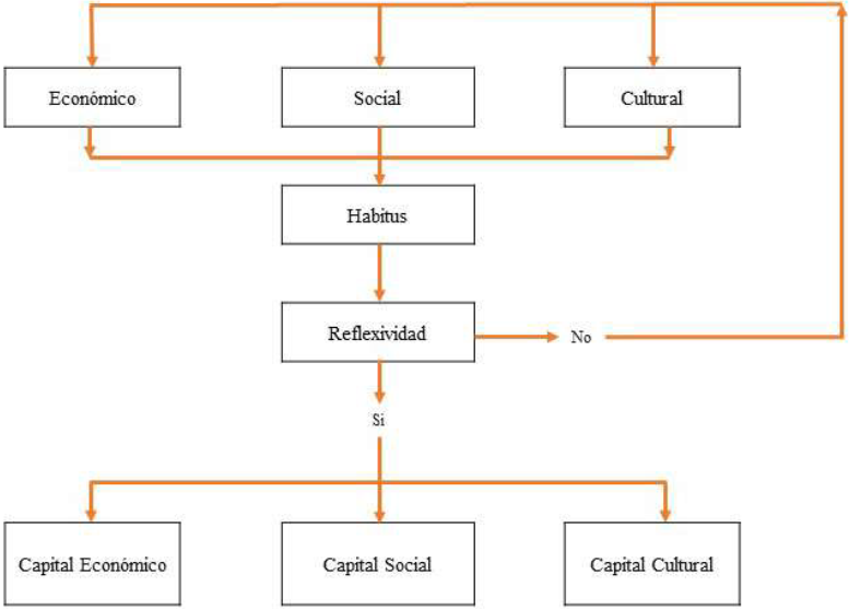 Así, para que un individuo reconozca al capital económico (cantidad de recursos disponibles y las estrategias para maximizar sus beneficios), al capital social (las relaciones sociales vistas como un recurso que permite acceso a mercados de trabajo y vivienda) y al capital cultural (aquellos recursos dotados de hábitos, costumbres, aprendizajes que pueden ser utilizados para la reproducción social, económica, política, etc.), como recursos y herramientas que puede poner en práctica en la elección residencial, se requiere un proceso de reflexividad, la deconstrucción del habitus y la construcción de un nuevo conjunto de conceptos y discursos que lo conformen. Por tanto, un individuo que no realice este proceso de reflexividad podría tener mayores posibilidades de repetir, mediante sus prácticas, todos esos aprendizajes adquiridos en la familia de origen, reproduciendo el habitus que le fue conferido de acuerdo con el campo social en el que nació (ver figura 2).