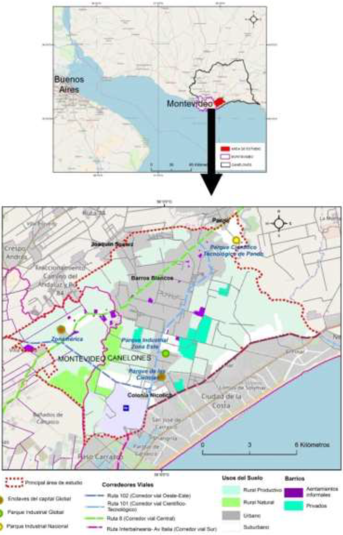 En primera instancia, para precisar el área de estudio se fueron identificando las principales transformaciones espacio-temporales que ocurrieron en la región noreste del área metropolitana de Montevideo. En la medida que fue avanzando la investigación, fueron surgiendo nuevos elementos a considerar, que se cruzaron con el objetivo planteado, y así poder delimitar con mayor precisión metodológica el área definitiva (figura 1). Fue un proceso de construcción permanente y no una delimitación fija a priori, como en la mayoría de las investigaciones que utilizan un estudio de caso. Toda delimitación presenta sus limitaciones ya que intenta condensar y resumir la realidad a un recorte espacial, a sabiendas de esta situación, el análisis no quedó sumergido en el área de estudio, sino por el contrario busco la relaciones multiescalares que a ella se vinculan.