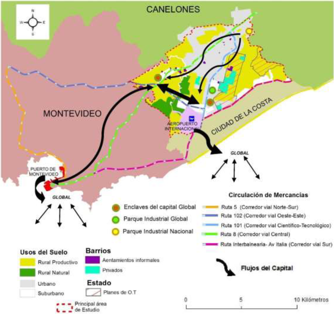 El tercero se vincula a la singularidad del área de estudio, ya que en términos de las dinámicas de acumulación de capital, existen varios elementos a destacar. El primer aspecto tiene que ver con la re-configuración del espacio que realizó el capital en tres décadas, partiendo de un espacio agrario, pasando por un archipiélago de fragmentos urbanos y llegando a la actualidad a la composición de un triángulo imaginario (figura 1 y 2), cuya base es la ruta 102, a su lado este la ruta 101 y del lado oeste la ruta 8, mientras que su vértice superior es la ciudad de Pando. El segundo aspecto se vincula con la instalación y crecimiento de enclaves, parques industriales y BP, que en apariencia parecen desconectados, pero en la realidad operan de forma articulada ante el Estado y el resto de la población.