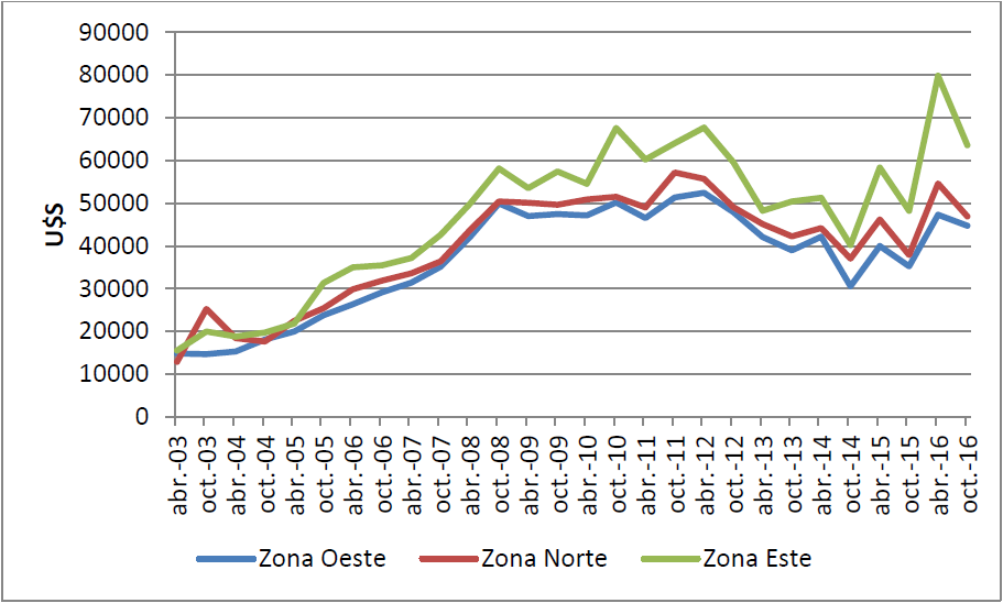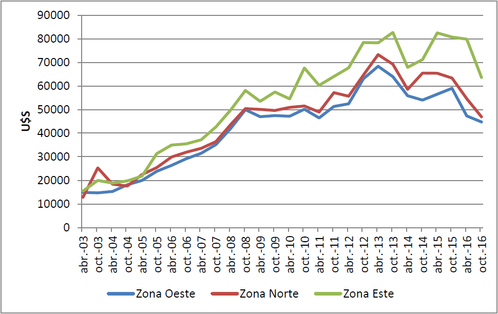 De acuerdo con los datos relevados, entre 2003 y 2016, se produjo un incremento considerable en el precio de los departamentos de un dormitorio en las tres zonas. En la Zona Este el precio promedio creció un 309%, en la Zona Norte un 264% y en la Zona Oeste un 200%. Si en abril de 2003, un departamento de un dormitorio estaba valuado, en promedio, en U$S14.874 en la Zona Oeste, U$S12.886 en la Zona Norte y U$S15.517 en la Zona Este, en 2016, esos valores fueron de U$S44.743, U$S46.960 y U$S63.614, respectivamente.