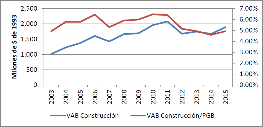 Este desigual desempeño está relacionado con las dificultades que encontraron la construcción y el sector inmobiliario para mantener, desde 2009, el dinamismo del período 2003-2008. Luego de la profunda caída que sufrió en 2002, la construcción creció, entre 2003 y 2015, a una tasa promedio anual del 5,31%, lo que significó una expansión acumulada del 86,12%. Sin embargo, ese comportamiento no fue constante. Desde 2003 el sector experimentó una actividad creciente que le permitió alcanzar un máximo en 2011. Las tasas de crecimiento promedio son una clara evidencia del comportamiento diferenciado: 10,4% anual entre 2003 y 2008 y 1,84% desde entonces.