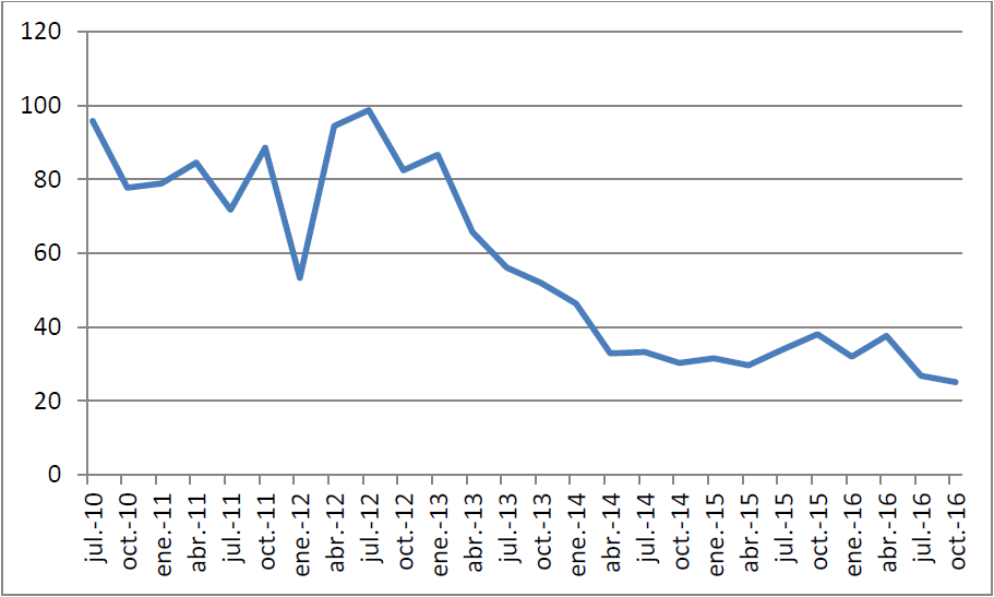 Desde fines de 2011, los empresarios del sector destacaron la restricción a la compra de divisas como el elemento clave del estancamiento. Ante eso, reclamaron que la vuelta a la estabilidad en el tipo de cambio sería una condición necesaria para la reactivación del mercado inmobiliario (“El mercado inmobiliario se redujo a la mitad desde 2011”, 10 de octubre de 2014). Sin embargo, la eliminación de esas restricciones en diciembre de 2015 no generó las condiciones para ese repunte.