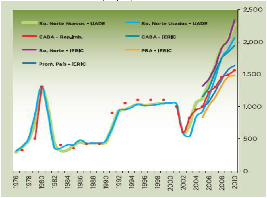 En primer lugar, diferentes investigaciones evidencian que la tendencia creciente de los precios de los inmuebles es compartida por distintas ciudades. Baer (2008) señala que en la Ciudad Autónoma de Buenos Aires, entre 2001 y 2006, el precio en dólares de un departamento nuevo de tres ambientes y 60 m. se incrementó 37,2% en Palermo y 32,2% en Villa Urquiza. Por su parte, Barenboim (2013) apunta que en Rosario, entre 2001 y 2010, el precio en dólares de las viviendas unifamiliares usadas de dos dormitorios creció, en promedio, un 139,4%, mientras que el de las de tres dormitorios se incrementó un 137,9% y el de las de cuatro un 141,4%. En consecuencia, las explicaciones no deben encontrarse solamente en aspectos particulares de cada ciudad, sino en elementos ligados al desarrollo de la acumulación durante la posconvertibilidad.