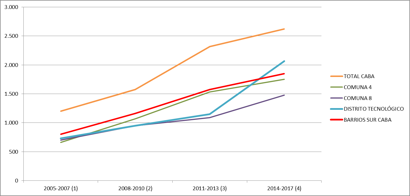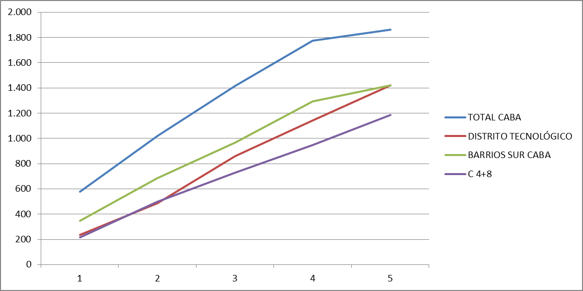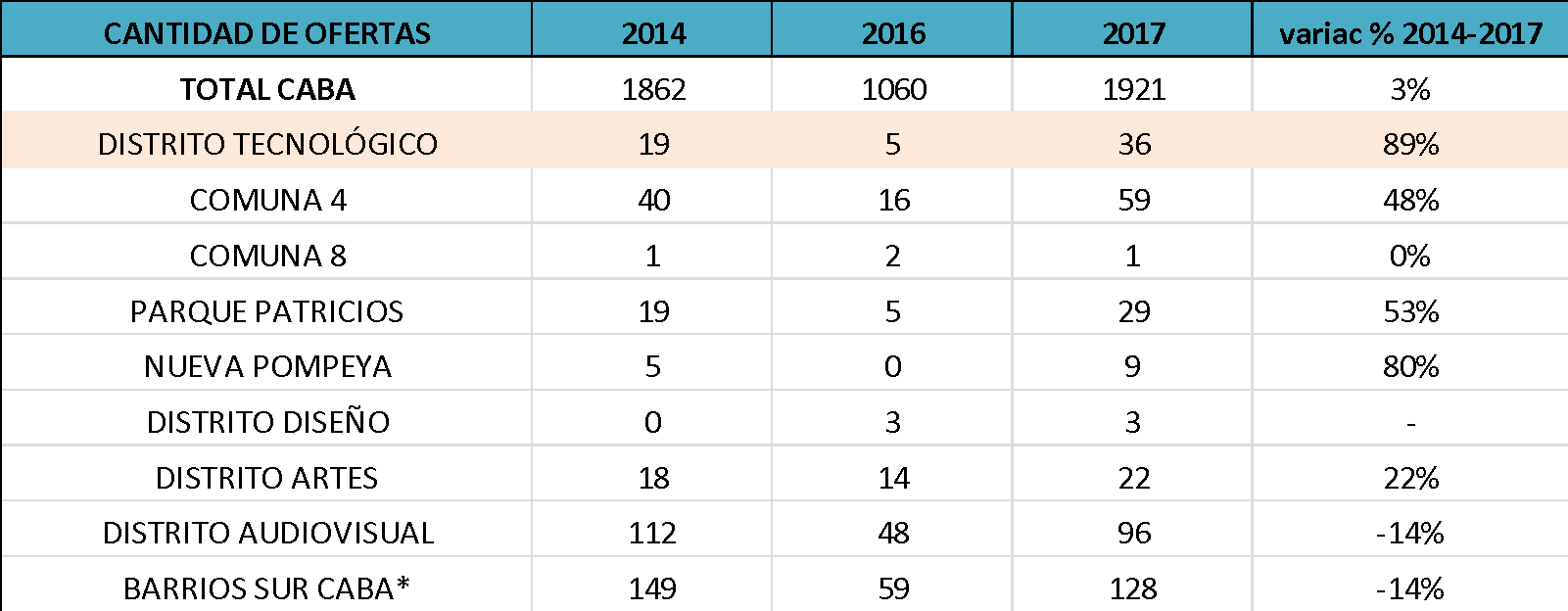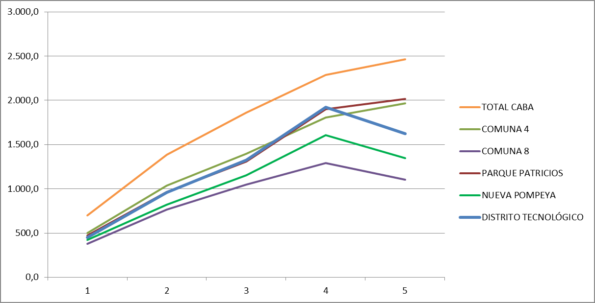 Del total de ofertas, los barrios del Sur representaron 25.136 casos, es decir, casi el 16%, de los cuales 5.717 casos (menos del 4%) corresponden a la Comuna 4. Por su parte, el área del Distrito Tecnológico representó 689 casos (entre el 0,3% y el 0,4%) del total de las ofertas de la ciudad a lo largo de toda la serie. Estos datos nos permiten señalar que la participación del DT en la dinámica inmobiliaria de los departamentos de viviendas en toda la Ciudad es mínima.
