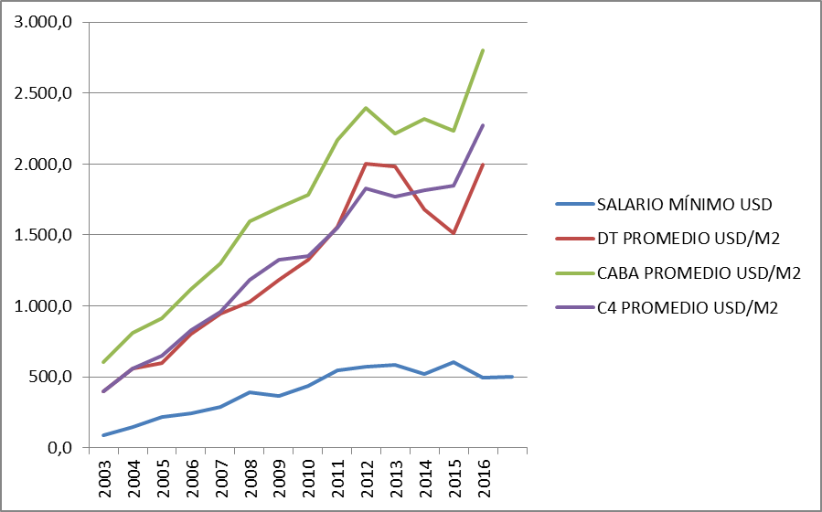 Sólo a modo de aproximación de la capacidad de acceso del sector trabajador a la vivienda en la ciudad, el Gráfico 3 permite comparar la evolución del Salario Mínimo, Vital y Móvil en Argentina[6], con la del precio del metro cuadrado de departamentos en el área del DT, Comuna 4 y Ciudad. Como puede observarse, la tendencia es a que la brecha entre estas dos variables aumente, lo que representa un esfuerzo cada vez mayor para acceder a la vivienda en la Ciudad y el DT en particular.