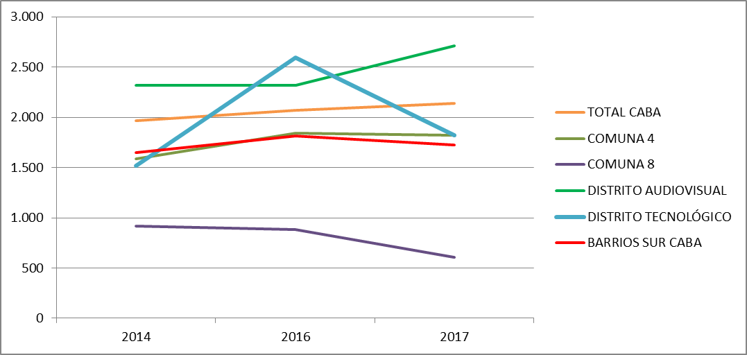 Respecto a la evolución entre los extremos de la serie, en la Tabla 9 se observa que la valorización para el promedio de la CABA fue del 9%. Por su parte, las categorías del sur de la Ciudad arrojan resultados dispares: la Comuna 4 duplica esta valorización, con un 18%, pero los Barrios del Sur se valorizan por debajo del promedio de la Ciudad: un 5%. Por su parte, el DT se valoriza un 20%, superando el resto de las unidades territoriales. En el Gráfico 5 se destaca además un salto para 2016 en el DT, donde el precio de las oficinas supera inclusive el promedio de toda la Ciudad y del Distrito Audiovisual (emplazado en la zona norte, más valorizada). Esto coincide con las declaraciones en entrevistas exploratorias de representantes de inmobiliarias destacadas del DT (Puebla). Sin embargo, se observa una significativa caída en el 2017 para varias unidades territoriales, siendo el DT, junto con la Comuna 8, la que más cae (30%). Esto puede explicarse por un reacomodamiento de los precios de mercado luego de un fuerte efecto de expectativas en la zona, así como también por la crisis económica en general. De todos modos, dadas las consideraciones metodológicas señaladas, conviene tomar estos datos cautelosamente.