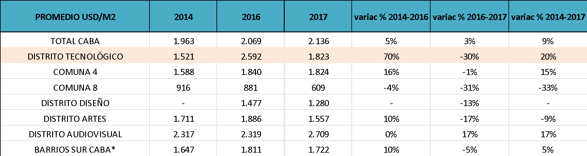 Si bien el mercado inmobiliario de oficinas en el sur de la Ciudad es muy pequeño, al analizar el precio promedio en dólares por metro cuadrado ofrecido, las cifras que arrojan los datos de 2017 también son significativas. Para este último año, el precio promedio de la CABA fue de U$S 2.136 el metro cuadrado, y de U$S 1.722 para los Barrios del Sur. El DT presenta valores similares al promedio de toda la Comuna 4 (U$S 1.823), que superan la media de los Barrios del Sur, lo que revela una importancia relativa de esta Comuna en los precios de oferta de oficinas.