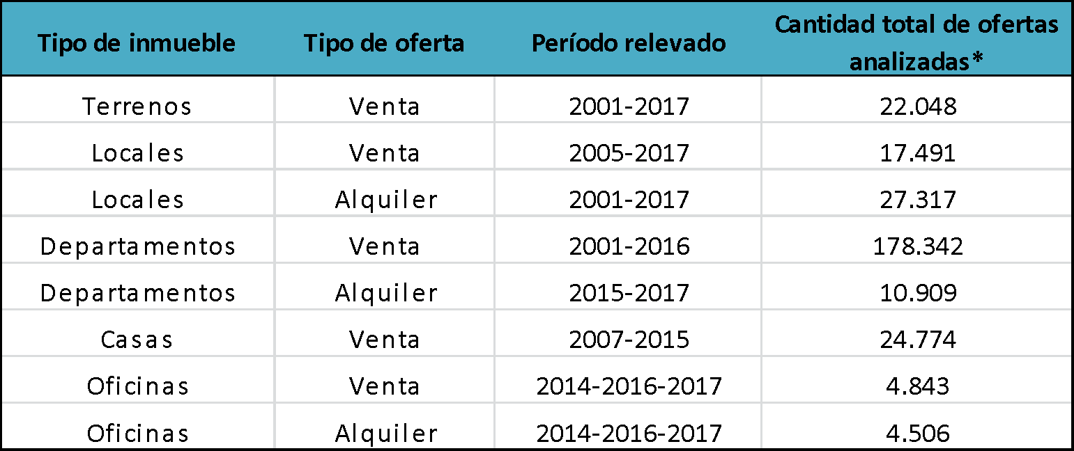 Para realizar este trabajo, se elaboró una base de datos a partir de relevamientos de ofertas de diferentes tipologías inmobiliarias (terrenos, locales, departamentos, casas y oficinas) para toda la Ciudad de Buenos Aires, todas las Comunas, todos los barrios, y una serie específica de unidades territoriales significativas, que fueron construidas de acuerdo a los objetivos de la investigación, para los años 2001 a 2017 (dependiendo del tipo de inmueble, algunas series están incompletas, ver más adelante). De esta serie, se analizaron las ofertas a partir del año 2003, evitando que los valores quedaran traccionados por los bajos precios del 2001 y 2002, luego de la crisis. A modo de síntesis del relevamiento, se presentan la Tablas 1 y 2.