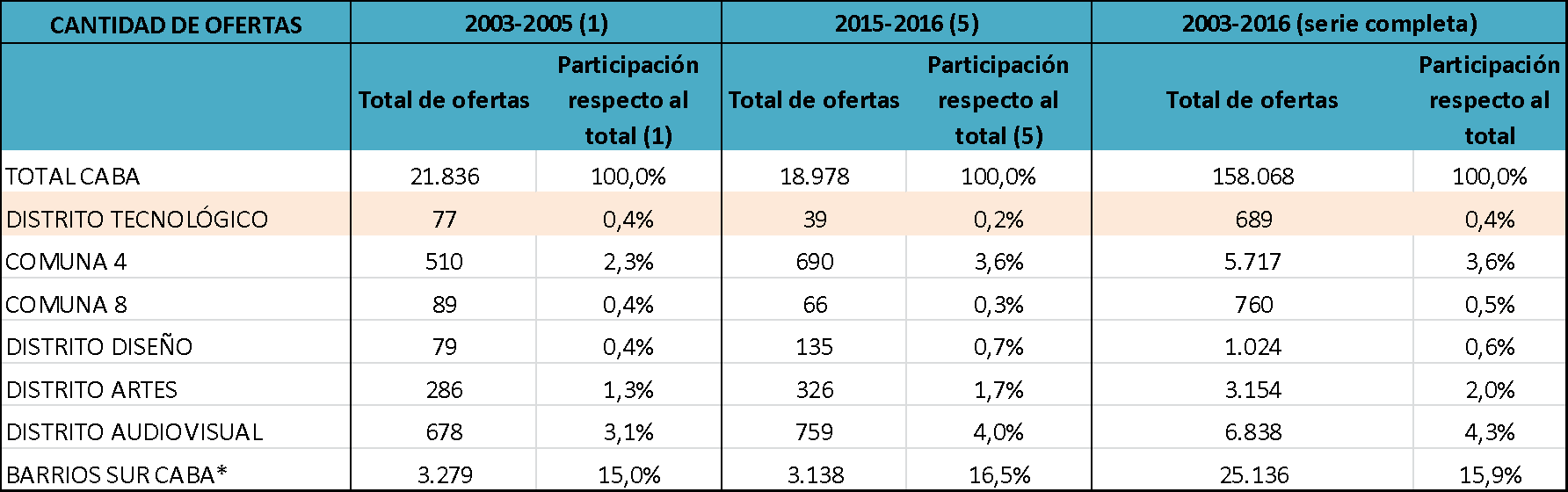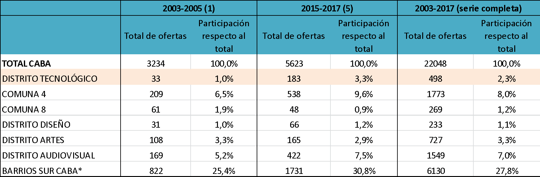 Del promedio total de ofertas para la Ciudad entre 2003 y 2017, el 28% se localizó en los Barrios del sur (6.130), y un 8% en la Comuna 4 (1.773). Por su parte, el DT pasó a representar del 1% (33) al 3,3% (183) del total de las ofertas de la Ciudad, a lo largo del período. Esto señala que, si bien la participación de las ofertas en el DT es pequeña con respecto a la Ciudad, esta va creciendo hasta más que triplicarse a lo largo de la serie.