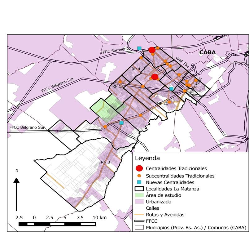 La primera fue la identificación de áreas de expansión urbana alejadas de las principales centralidades del municipio. Para la definición de estas centralidades se buscó combinar la diferenciación tipológica de centralidad tradicional / nueva (Abba, 2005) con jerarquías en términos de centros y subcentros, como propusieron Vecslir et al. (2017) al distinguir “subcentros metropolitanos” para su eje de estudio. Esta última distinción resulta pertinente para dar cuenta de las dinámicas al interior de un distrito tan extenso como La Matanza.
