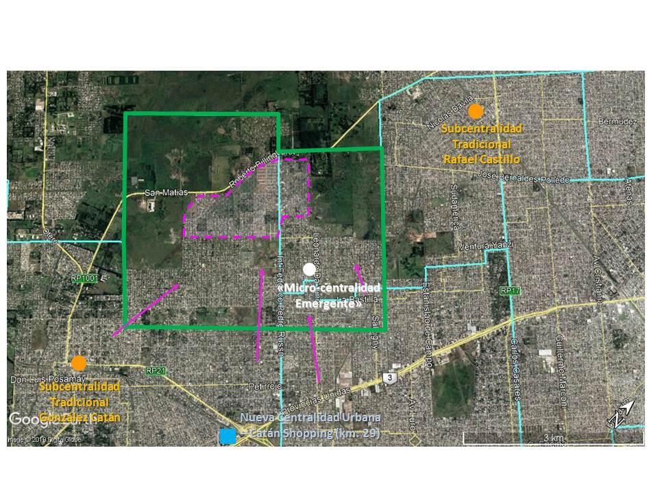 En nuestra área de estudio, el ejemplo más claro de esto es la consolidación de la sala de salud y la creación en el año 2013 de una nueva delegación municipal de desarrollo social en un área en la que ya existían escuelas y comercios. Se trata del sector demarcado en la Figura 2 y que definimos como “micro-centralidad emergente”. La creación de esta nueva delegación municipal da cuenta de modo simultáneo tanto del avance de una política de descentralización municipal como del veloz crecimiento demográfico y urbano que registró este sector en los últimos diez años.