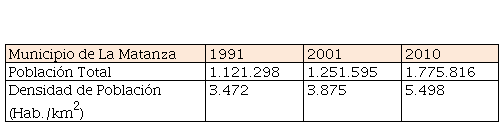 Dentro de la RMBA, La Matanza tiene una superficie de 323 kilómetros cuadrados e incrementó su población en los dos últimos períodos intercensales de manera significativa, especialmente entre 2001 y 2010 (Cuadro 1), años entre los cuales aumentó en medio millón de habitantes y su densidad de población pasó de 3.875 habitantes por kilómetro cuadrado a casi 5.500 (Matossian, 2017).