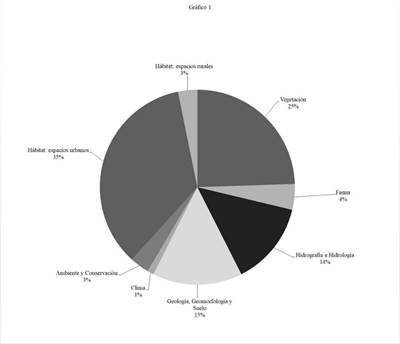 Tal y como se desprende del gráfico 1, se observa una fuerte presencia de trabajos derivados de las ciencias físico-naturales (vegetación 25%; geología, geomorfología y suelo 15%; hidrografía e hidrología, 14%) que en conjunto representan el 54%. Asimismo, se identifica rápidamente un segundo conjunto de investigaciones volcado al estudio de procesos sociales, desde la mirada del hábitat y los espacios urbanos (35%) y con una fuerte preocupación por el crecimiento urbano. Muy alejadas de estos grupos, las producciones que se interesan por la fauna (4%), el clima (1%) y el vínculo ambiente-conservación (3%) son las menos numerosas. Desde el campo de las ciencias humanas y sociales, algo similar ocurre con los estudios rurales que apenas alcanzan al 3%.
