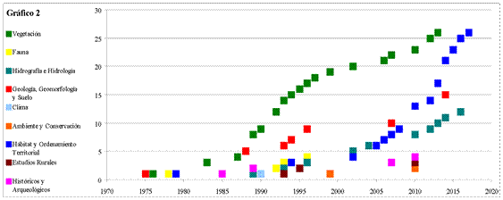 Resulta interesante observar además, que a lo largo del tiempo se mantienen constantes algunas preocupaciones, otras muestran ritmos cíclicos y otras aparecen y desaparecen sin indicios de continuidad. Dentro del primer conjunto destacan las preocupaciones relativas a la vegetación y a la hidrografía e hidrología, en el segundo conjunto las relativas, por ejemplo, a la geología, geomorfología y suelo; en el tercer conjunto, las referidas a fauna, ambiente y conservación, los estudios rurales y los referidos a clima.