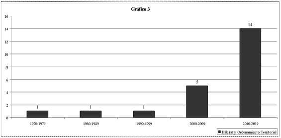 Los trabajos que integran el primer subgrupo son 4 y han sido gestados en 1985, 1989, 2007 y 2010 respectivamente. Los que integran el conjunto de estudios rurales, son 3 y han sido publicados en 1993, 1995 y 2010. Finalmente, los que integran el tercer conjunto, articulados a las preocupaciones por el hábitat y el ordenamiento territorial son 22, se inician en el año 1979 y crecen sobre todo a partir del año 2000 (Gráfico 3).