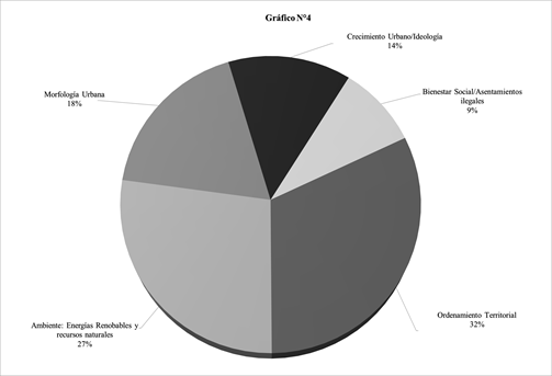 Tal como se observa en el gráfico 4, dentro del conjunto de producciones académicas que reconocen intereses vinculados al hábitat y ordenamiento territorial y donde se decía, destacan las preocupaciones por el avance urbano (22), se distinguen cinco paquetes temáticos. Uno congrega trabajos que analizan el binomio bienestar social / asentamientos ilegales (9%), otro tematiza la noción de crecimiento urbano (14%), el tercero gira en torno a las preocupaciones por la morfología urbana (18%), un cuarto se ocupa de la relación sociedad-recursos naturales (27%) y, finalmente, un quinto grupo reconoce como eje ordenador las preocupaciones por el ordenamiento territorial (32%).