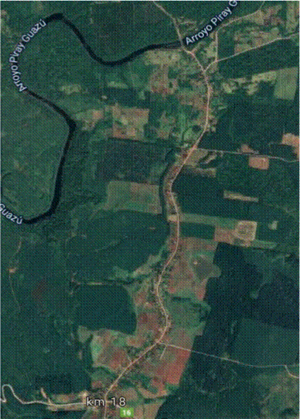Piray km 18 se fundó alrededor de la antigua empresa Celulosa Argentina entre las décadas de 1950 y 1960. Actualmente la mayor parte de las tierras en que se asienta la colonia y las plantaciones forestales son propiedad de la transnacional ARAUCO S.A[5]. Las casas se hallan en una franja de poco más de 70 metros al margen de la ex ruta 12, un camino de 4 km atravesado por el arroyo Piray Guazú y la ruta provincial 16, y el paisaje se caracteriza por la dimensión de las plantaciones forestales. A diferencia de otras colonias, Piray km 18 está organizada en tres barrios: Santa Teresa, Unión y Cruce[6]. La siguiente imagen satelital permite visualizar como se ubican las casas en los márgenes de la ex ruta 12 y la dimensión del espacio de las plantaciones.