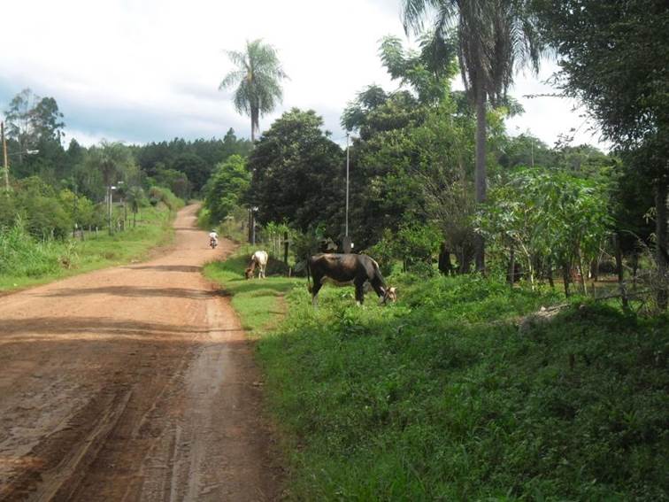 Las casas que se ubican en el barrio Santa Teresa, próximo al departamento de Eldorado, cuentan con mayores extensiones de tierra, con lotes de hasta 10 hectáreas. Quienes viven allí tienen una producción un poco más diversificada que los vecinos de los otros barrios. A medida que se avanza por la ex ruta 12 hacia el barrio Cruce –que se encuentra en la intersección entre la ex ruta12 y ruta 16–, las chacras pasan a tener menor tamaño, se reducen a no más de 2 hectáreas. En la siguiente imagen se puede observar que la cría de animales se realiza a la vera del camino por falta de espacio.