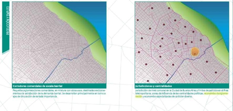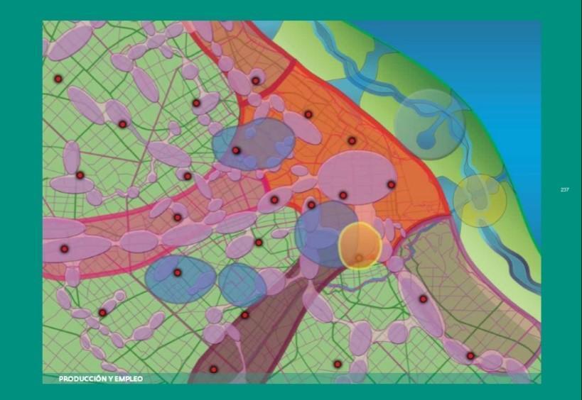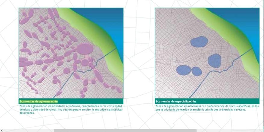 Para acceder con más claridad a la modelización territorial de estos principios, incluimos en la Imagen Nº 5, recorte del plano del área delimitada para compararlo con el esquema del documento de la Comuna 8. Esto ilustra la concentración de economías de aglomeración: puede verse que dichas zonas coinciden en general con las coloreadas en el MT. Por su parte, las economías de aglomeración concuerdan parcialmente con la zona delimitada por la Ley; también la zona de aglomeración especializada concuerda parcialmente con ella.