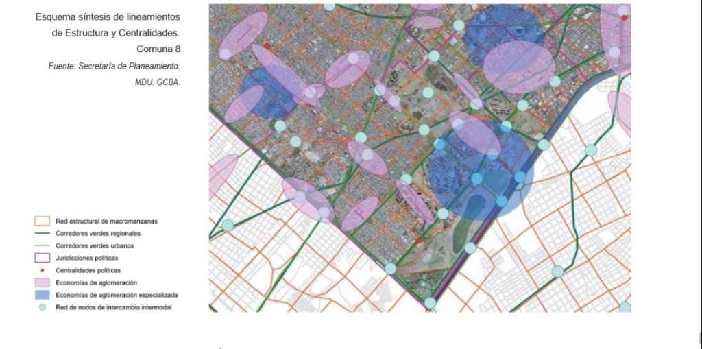 Si nos volcamos a un análisis del PC8, en su sección “Lineamientos propositivos”, ítem Estructura y Centralidades, hallamos que la creación de estas zonas de aglomeración y las respectivas economías de especialización, requieren del rediseño de las características urbanas de los barrios de la Comuna. En dicho documento se enfatizó la relación espacialidad-economía/empleo: de su lectura se desprende que parece necesario realizar una modificación estructural en la superficie donde se desarrollará una zona de economía de aglomeración.