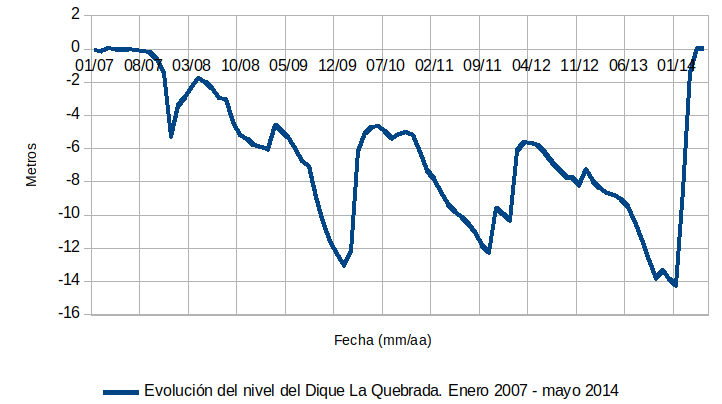 Como se desprende de la Figura 2 que condensa los datos de los niveles de agua del Dique La Quebrada, el único embalse de la región, la crisis hídrica había comenzado en el año 2007 y se prolongó hasta el 2014, afectando a toda la región de Sierras Chicas.