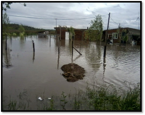 Más adelante, el 4 de noviembre de 2012 sucedió un temporal que produjo el desborde del río Matanza y su tramo rectificado debido al crecimiento de su caudal, consecuencia del gran volumen de agua que provino de los campos ubicados cuenca arriba en los municipios de Cañuelas y Ezeiza (Diario Popular, 02/11/2012)[18]. Ello generó la inundación de los barrios 9 de Enero, Villa Transradio, San Agustín, El Fortín, y El Gauchito ubicados en la localidad de 9 de Abril, evacuando al menos 60 personas. Los vecinos más afectados fueron los que habitaban en proximidades de la laguna de Rocha en el barrio 9 de Enero (Info Región 04/11/2012[19]; y ANRED, 31/11/2012[20]). Particularmente se indicaba que “Los evacuados son las familias que se asentaron a una cuadra de la laguna, pero todo ese barrio es donde fue ganando la laguna. Las familias nos contaban que iban y venían de su casa por temor al saqueo y que todavía tenían 10 cm de agua dentro de sus casas” (Info Región, 04/11/12) (véase Imagen 1). Los vecinos reclamaban a las autoridades municipales el rellenado de las calles anegadas con el correspondiente zanjeo (ANRED, 31/11/2012).
