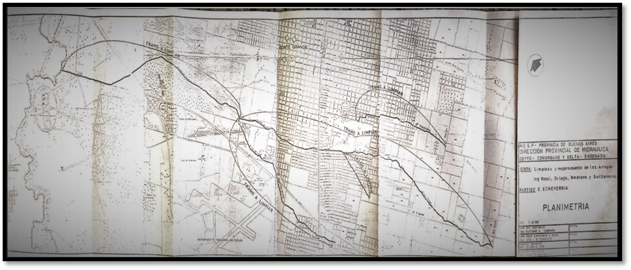 Entre los años 1994 y 1996, ante la contaminación de los cursos de agua que atravesaban al MEE que presumiblemente implicaba la obstrucción de desagües y desagotes por acumulación de residuos sólidos, la Dirección de Hidráulica del MOSP implementó la obra llamada Limpieza y Mejoramiento de los Arroyos: Ing. Rossi, Ortega, Medrano y Guillermina, Partido de E. Echeverría (como puede verse en la Imagen 2)[25]. No obstante, dichos cursos de agua continuaron manteniendo esta característica hasta la actualidad. En ACUMAR (2015), se informó que durante el año 2014 en el MEE se habían limpiado un total 165,08 km correspondientes a las márgenes de los arroyos Ortega, Ing. Rossi, Santa Catalina y Medrano, la rectificación del río Matanza y el canal Huergo.