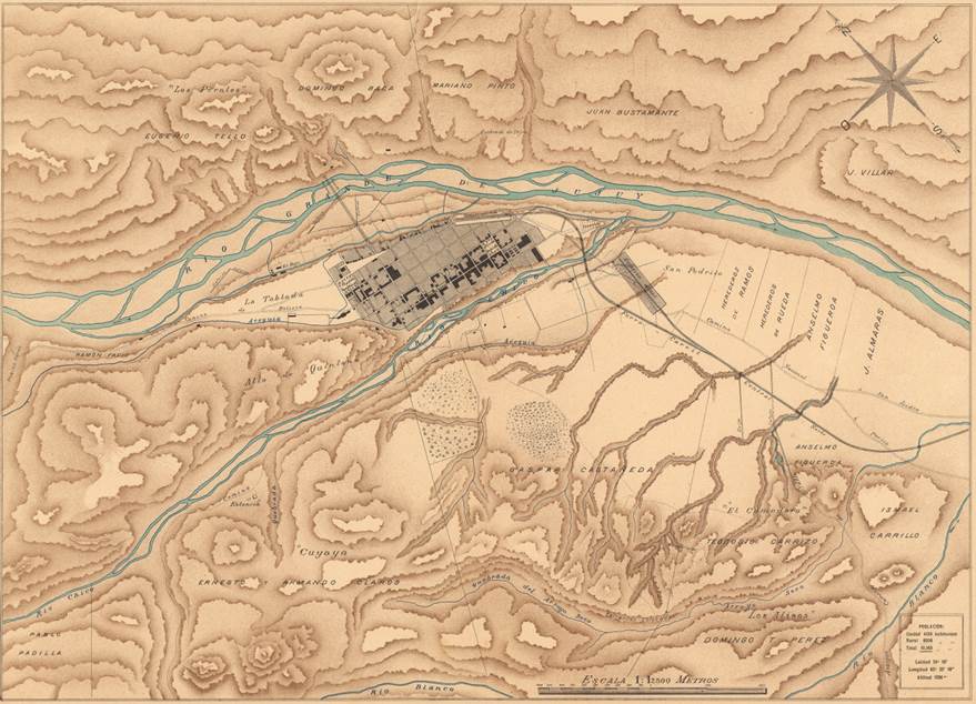Antes de pasar a analizar los vaivenes que originaron el primer reglamento de aguas, presentamos la disposición hídrica de los alrededores de la ciudad, que hacían necesario su sanción. Para ello contamos con un mapa del año 1901[3], pero que sirve de manera ilustrativa de la disposición geográfica del riego en la ciudad y alrededores. La ciudad era surcada por dos ríos, el Grande hacia el norte, el chico hacia el sur. Por la zona de Altos de la Quintana, al norte de la ciudad, corría la acequia mandada a construir por el Estado Provincial en 1852, mediante un contrato con Apolinario Ortiz, aspecto analizado por mí en una compilación de divulgación histórica (Hernández Aparicio, 2018) y que pretendía traer el agua desde el Río Reyes, bajando por dicho lugar, estableciéndose un compromiso de mantenimiento de la misma hasta 1854, a cambio de la concesión de tierras en La Tablada, adyacente a dicha acequia como puede observarse en el mapa. En el oeste de la ciudad, en Cuyaya, la Chacra del mismo nombre había sido comprada en dos partes por Justina Belaunde, en 1848 y en 1866, y para 1888 transferida a los hermanos Claros, por donde atravesaba el llamado Arroyo Seco. Como su nombre lo indicaba, dicha vertiente no poseía agua permanente, solo en épocas estivales. Por otro lado, las tierras de Gaspar Castañeda, situadas en la llamada Banda del Río Chico, al este de la ciudad, eran atravesadas por una acequia, sin embargo, el boleto de compra-venta de 1856 en donde adquiere dicha propiedad no menciona la posesión de riego, por lo cual podemos suponer que dicha acequia tampoco contaba con irrigación permanente. Todos estos aspectos han sido estudiados por un trabajo de mi autoría hasta 1884 (Hernández Aparicio, 2019).