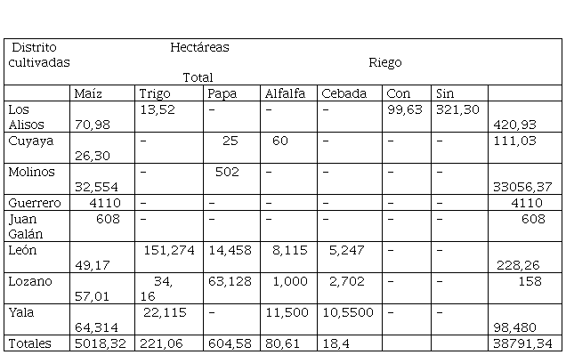 Del cuadro se desprenden datos interesantes. En primer lugar, podemos observar que en relación a la producción agrícola la principal era la maicera. Se concentraba principalmente en el distrito de Guerrero, hacia el norte de la ciudad. En un nivel mucho menor le seguía la producción de papa, que tenía su centro productivo en el distrito de Molinos. El trigo era también destacable, con el distrito de León como principal productor. Si bien se cultivaba alfalfa y cebada, las hectáreas no tenían demasiada relevancia en la producción del departamento.