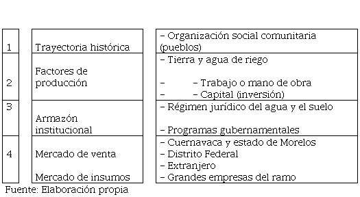 Un tercer elemento central es la condición del ejido como una agrupación de personas con personalidad jurídica y patrimonio propio, dotado de una estructura de poder u órgano de representación y gestión (Registro Agrario Nacional, 2012: 12), que le permitió una inserción social duradera y formas de acción política (Concheiro, 2001: 17). De esta forma, el condicionamiento histórico se fortaleció con una arquitectura institucional ad hoc, la presencia de los factores de producción indispensables y, cuando fue necesario reconfigurar la producción de autoconsumo y para comercio local por otra de carácter mercantil y de alcance regional, nacional e internacional, la organización comunitaria y su manejo colectivo del suelo y agua permitió concretar los ajustes necesarios. En la tabla 1 se condensan los factores señalados, que explican el desarrollo de la AUP a la que hacemos referencia.