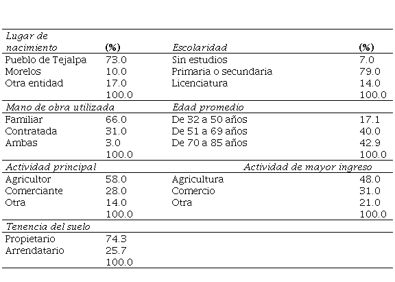 De la información recabada en trabajo de campo derivan las siguientes observaciones. En primer lugar, hay una apropiación del lugar y de la actividad agrícola por parte de los ejidatarios, al ser mayoritariamente nativos del pueblo de Tejalpa; 7.3 de cada 10 de los entrevistados nació ahí, uno de cada 10 nació en otro municipio de Morelos, y 1.7 de cada 10 nació en otra entidad (cuadro 1). Tres cuartas partes de los agricultores son propietarios de la tierra, pero ésta se ha venido arrendando; una cuarta parte ya lo hace. Dos circunstancias lo explicarían, primero, la edad avanzada (70 a 85 años) del 43% de los productores, y el avance en esa dirección de otro 40% (51 a 69 años); solo 17% tenía 50 años o menos años. Otro aspecto es que la pluri-actividad de los productores ocasiona una oscilación del tiempo dedicado a la agricultura entre ciclos, lo que lleva al arrendamiento de la tierra. Así, 58% de los productores dijo tener como actividad principal la agricultura, mientras que el 42% restante dedicó la mayor parte de su tiempo laboral a otra actividad, sobresaliendo el comercio (28%). En términos de aportación de ingresos, la importancia de la agricultura, aunque se mantiene en primer lugar (48% de los casos), la distancia con el comercio (31%) y “otras” actividades (21%) se acorta. Finalmente, uno de cada tres trabajadores agrícolas eran mano de obra contratada y los dos restantes eran integrantes de la familia a cargo de la parcela.