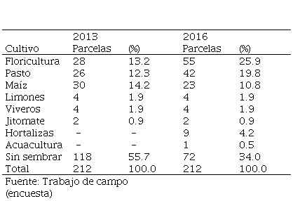 David Nava, Comisariado ejidal en 2011, y Gregorio Rodríguez, Comisariado en 2013, explicaron que las flores y el pasto son lo que más interesa producir a la población (cuadro 2), porque Jiutepec y toda la ZMC son un mercado importante de venta. Les sigue en importancia el maíz, del que una parte es para autoconsumo y otra parte se comercializa en el pueblo de Tejalpa y en el mercado de Jiutepec; hay quienes llegan hasta las parcelas a comprarlo, conocedores de su calidad. En este caso su producción y/o cosecha requiere contratar trabajadores, vecinos de los alrededores del ejido. Una menor cantidad de parcelas provee hortalizas y limón.